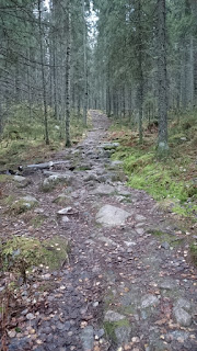 Hundra meter från hotellet startade vandringslederna, som det fanns totalt cirka 80 kilometer av. I och med att det var lite dimmigt och regn i luften, så bestämde vi oss för att gå bara en liten bit. Nå, sist och slutligen blev det 7,6 kilometer på 2 h. Upp och ner och hit och dit for det, och det var inte bara en gång jag höll på att ge upp när pulsen hackade på i 190 och backen framför sluttade lika hårt uppåt ännu 50 meter till. Men jag är ju ingen quitter, så vi kämpade oss vidare. Och det var nog absolut värt det, när man kom upp till de höga topparna och blickade ut över dimmiga landskap. Återigen måste jag poängtera att det var så himla synd att det råkade vara dimma hela helgen vi var på plats, men vad kan man.